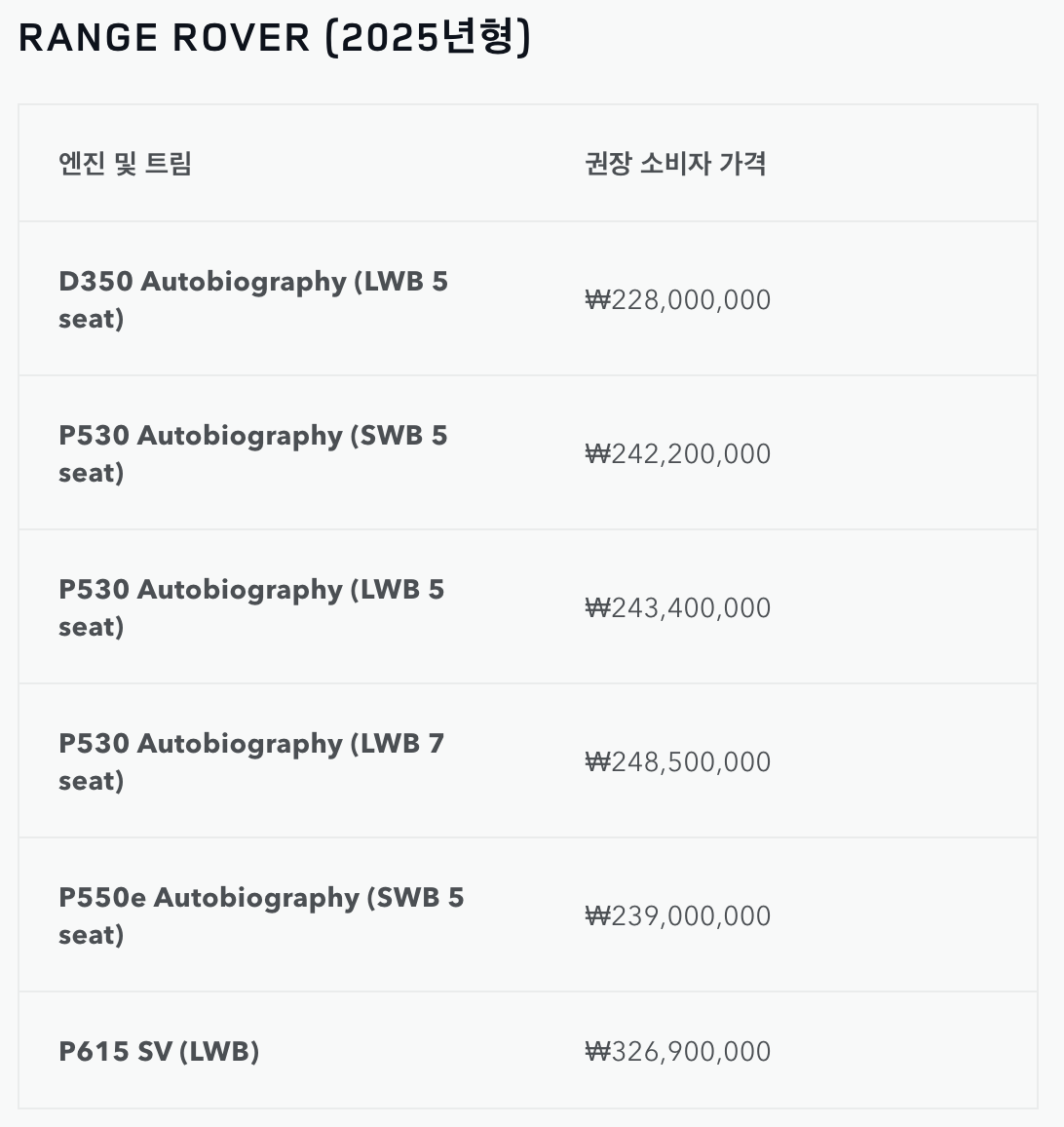 프리미엄 SUV의 대명사로 자리 잡은 랜드로버 레인지로버는 고급스러움과 오프로드 성능을 동시에 갖춘 플래그십 SUV입니다. 레인지로버는 다양한 트림과 파워트레인 구성으로 출시되어 소비자의 용도와 취향에 따라 폭넓게 선택할 수 있습니다. 이번 글에서는 2025년형 레인지로버의 트림별 가격, 특징, 구성 등을 상세히 정리해드립니다.